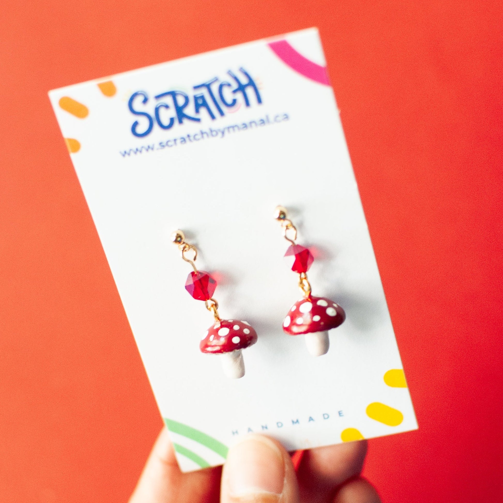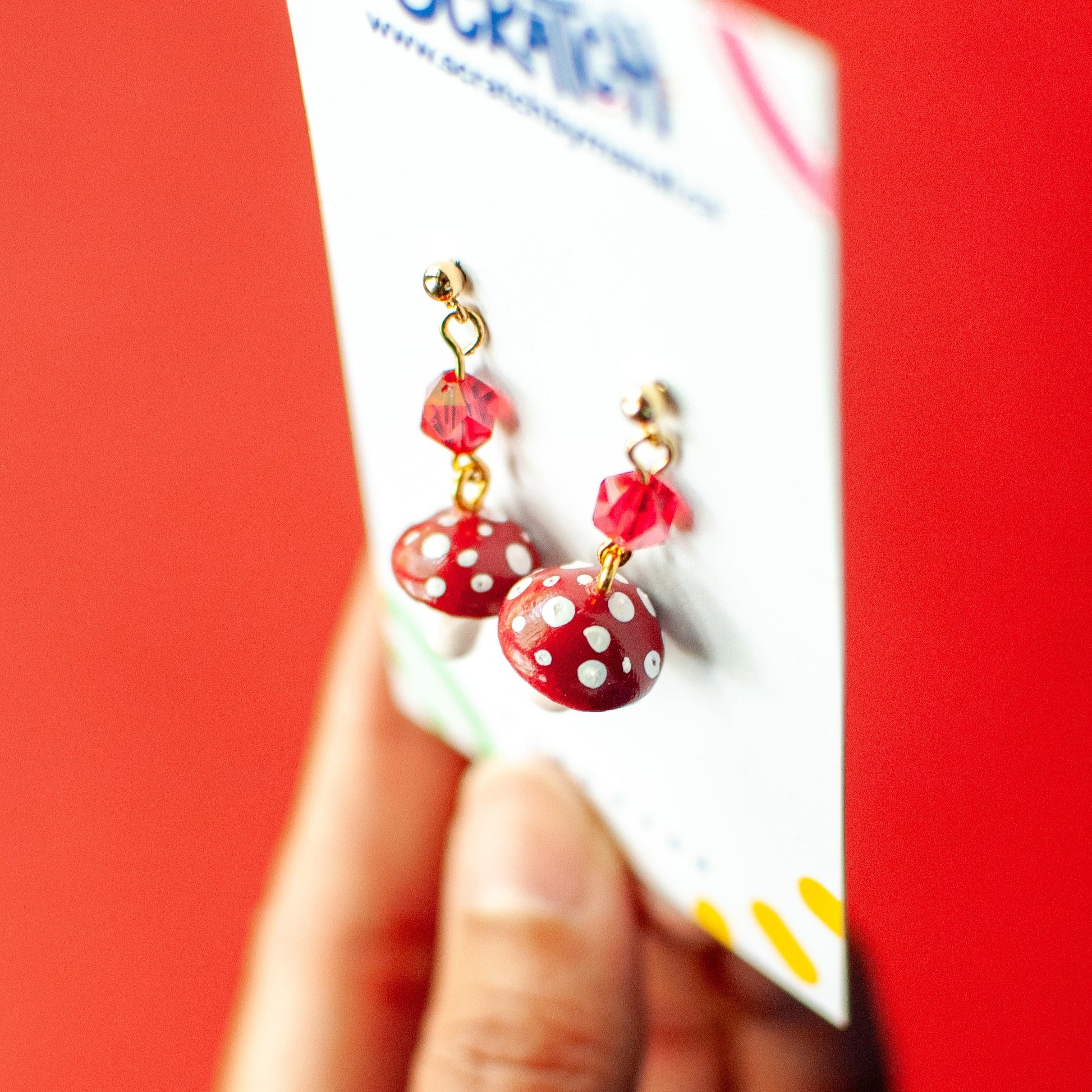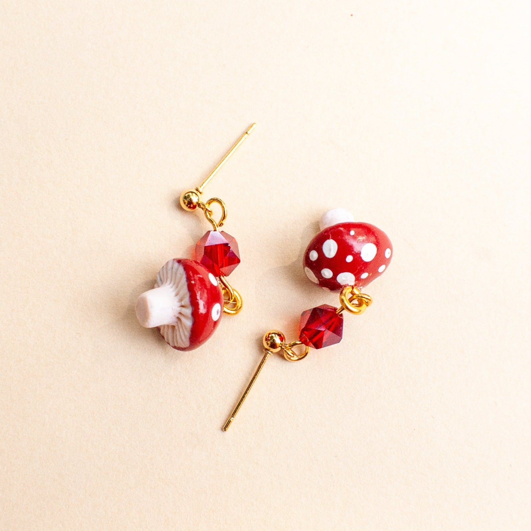 Sweet little speckled handmade polymer clay mushrooms charms with a bright red glass bead accent. Perfect for all your fairy frolicking needs.