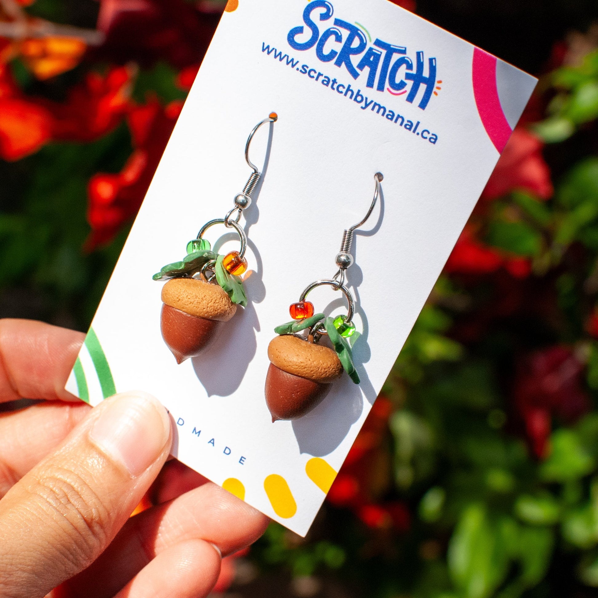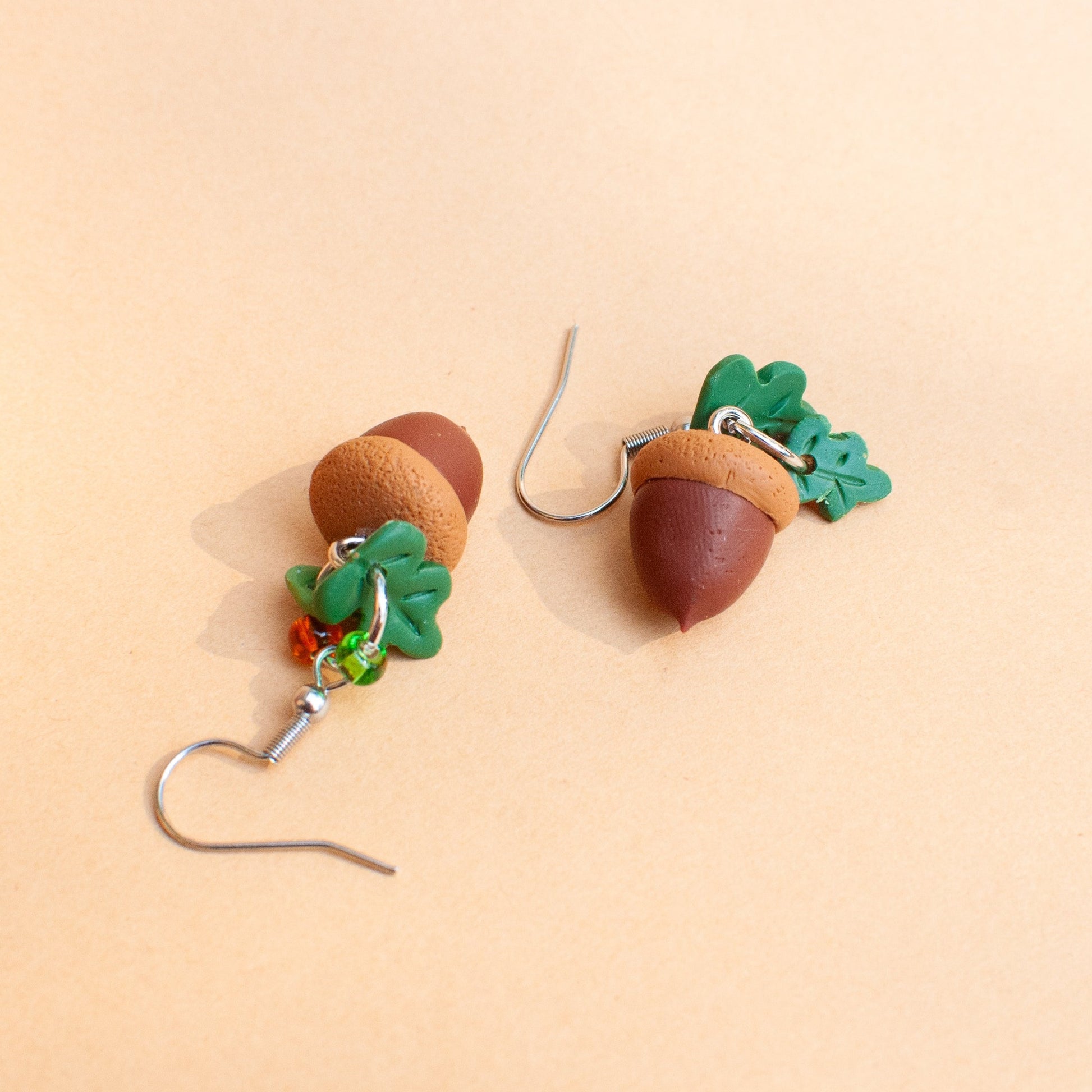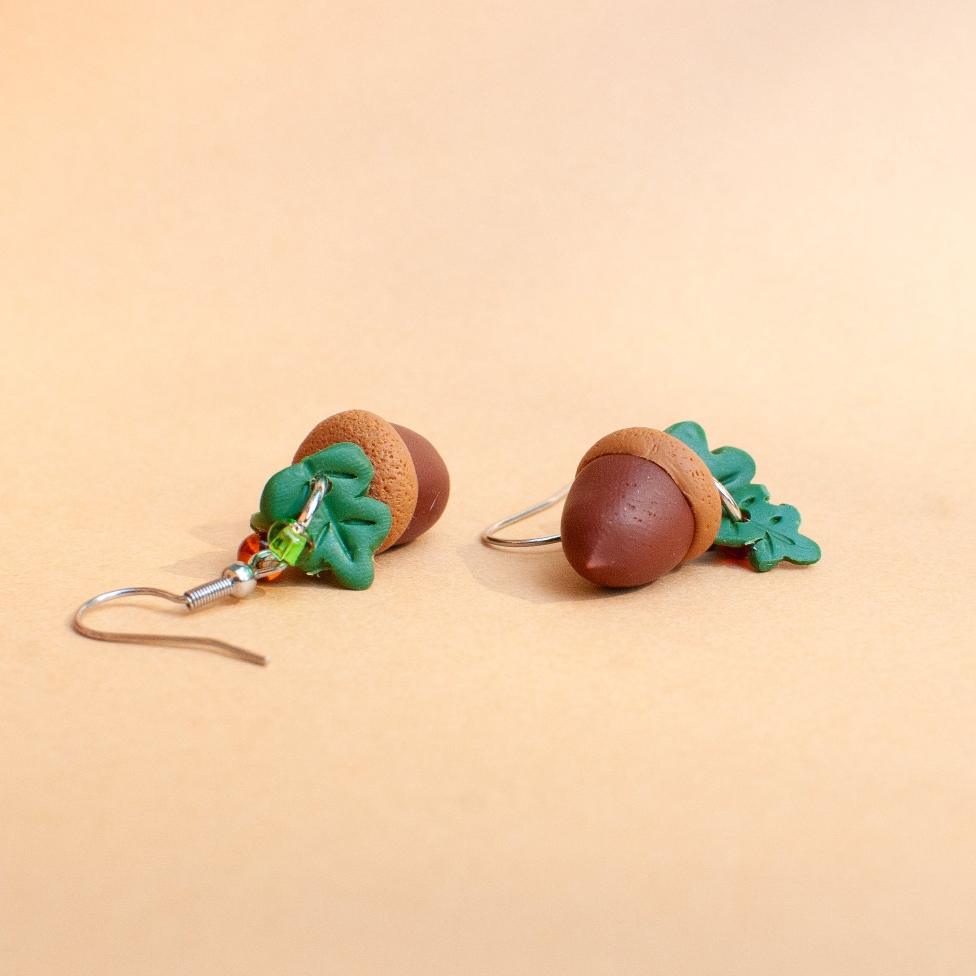 These handmade mini acorn charms feature two little leaves and two glass bead accent for a cute and glam autumn style on a multi feature dangle earring.