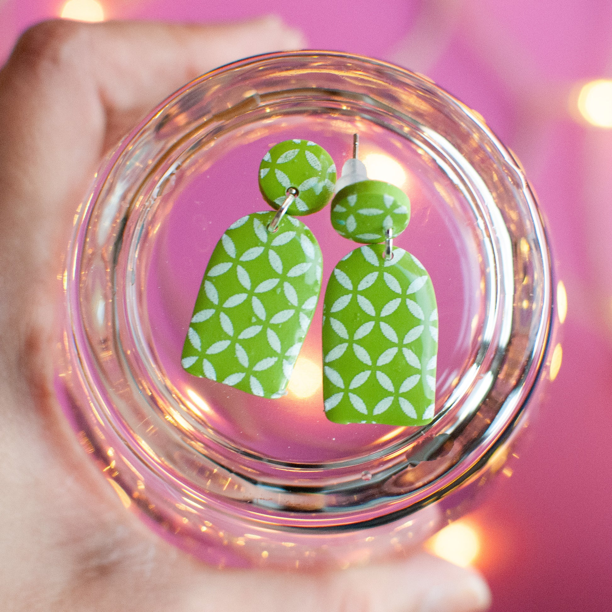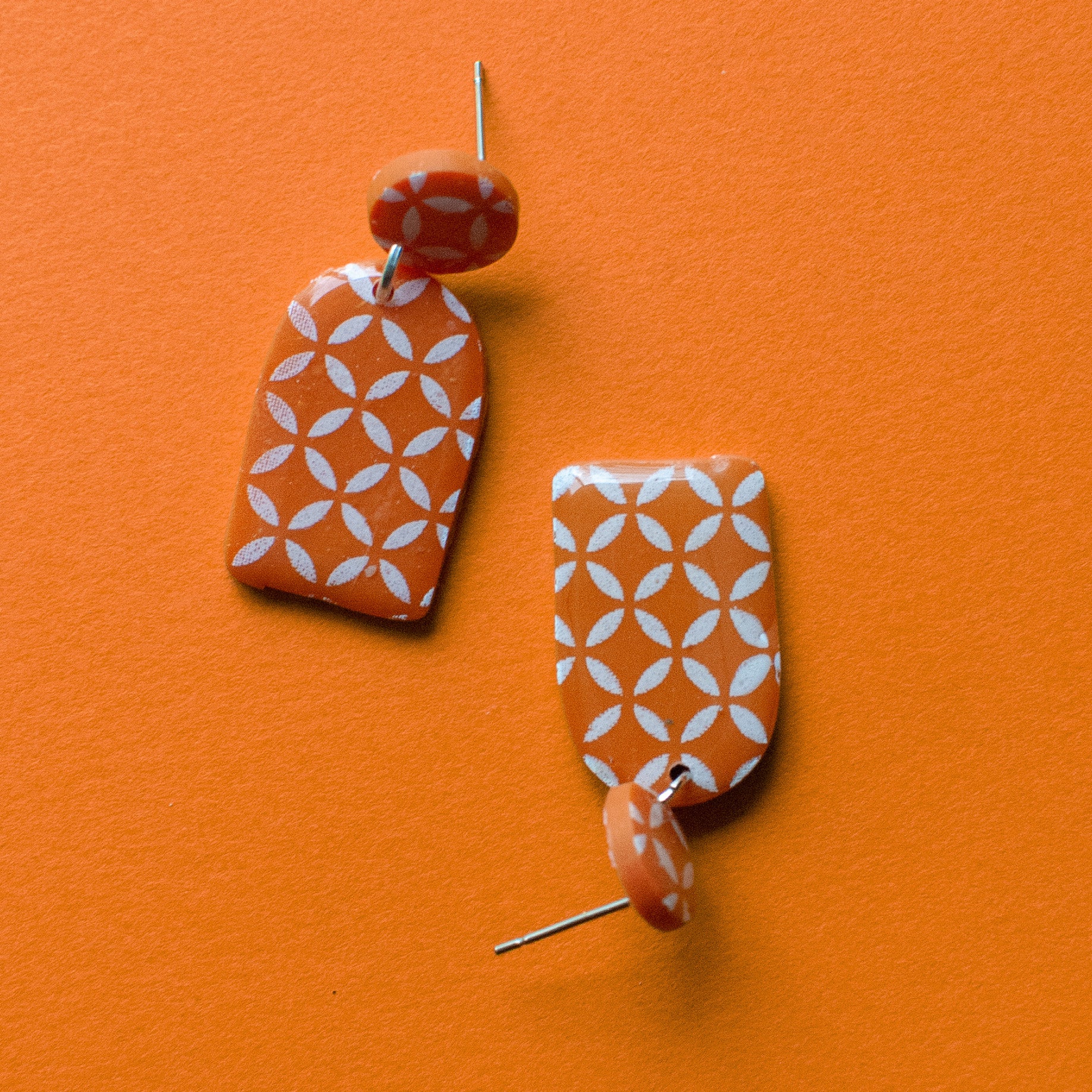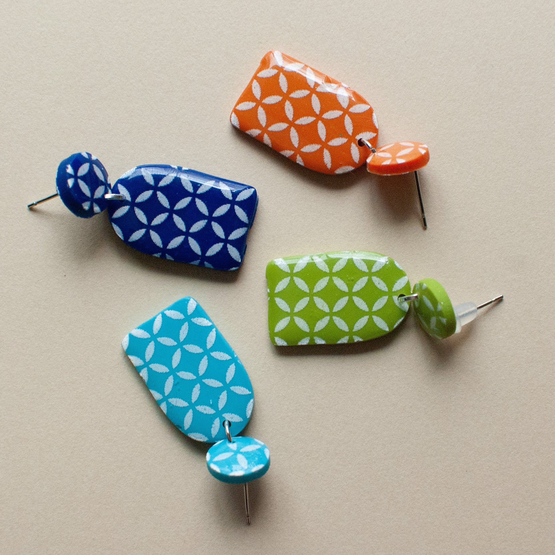 Colourful arch shaped polymer clay earrings with a geometric pattern and a resin finish! Hypoallergenic stainless steel earring posts.