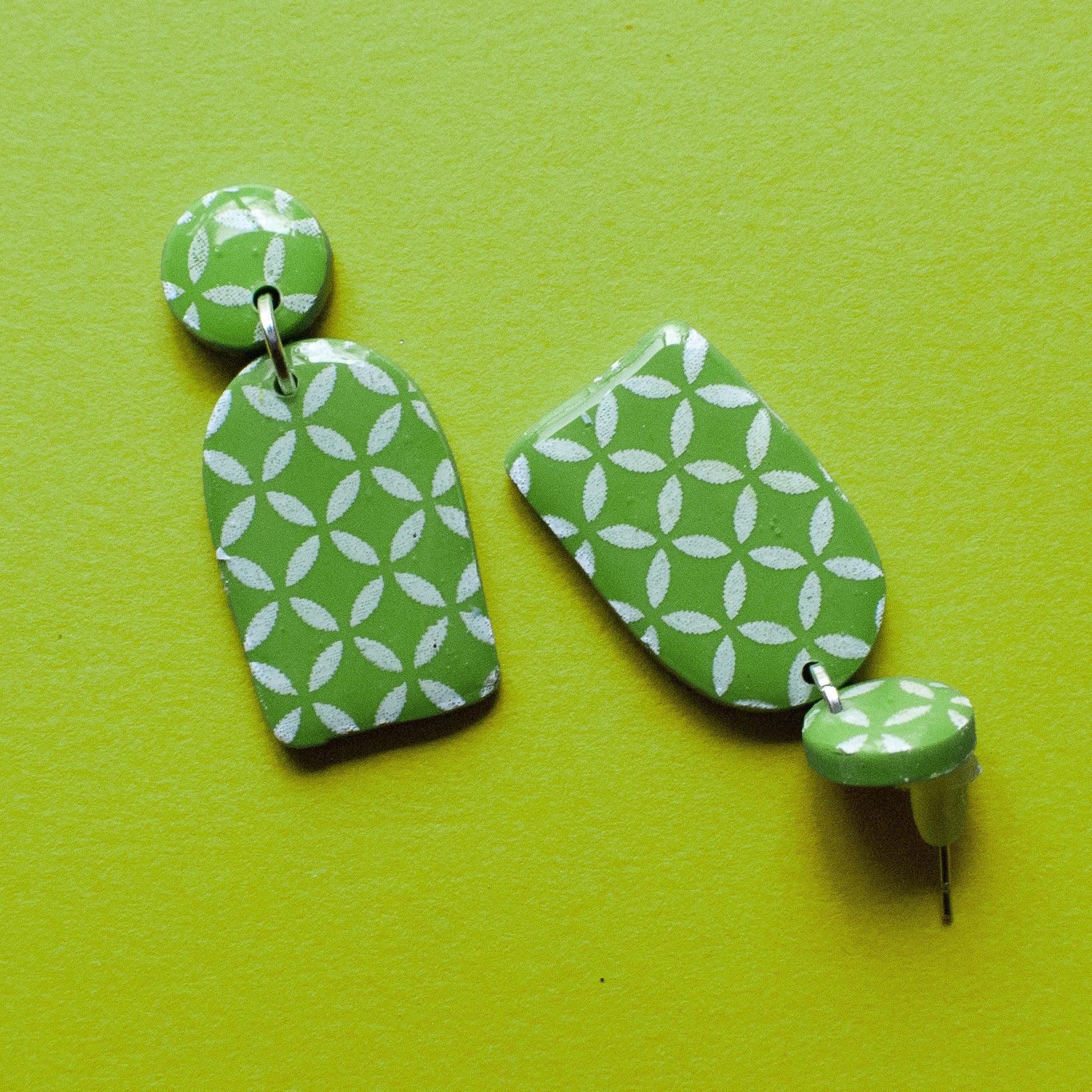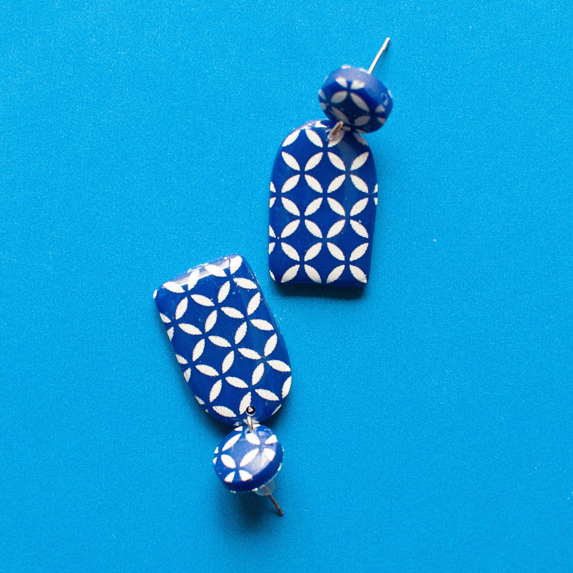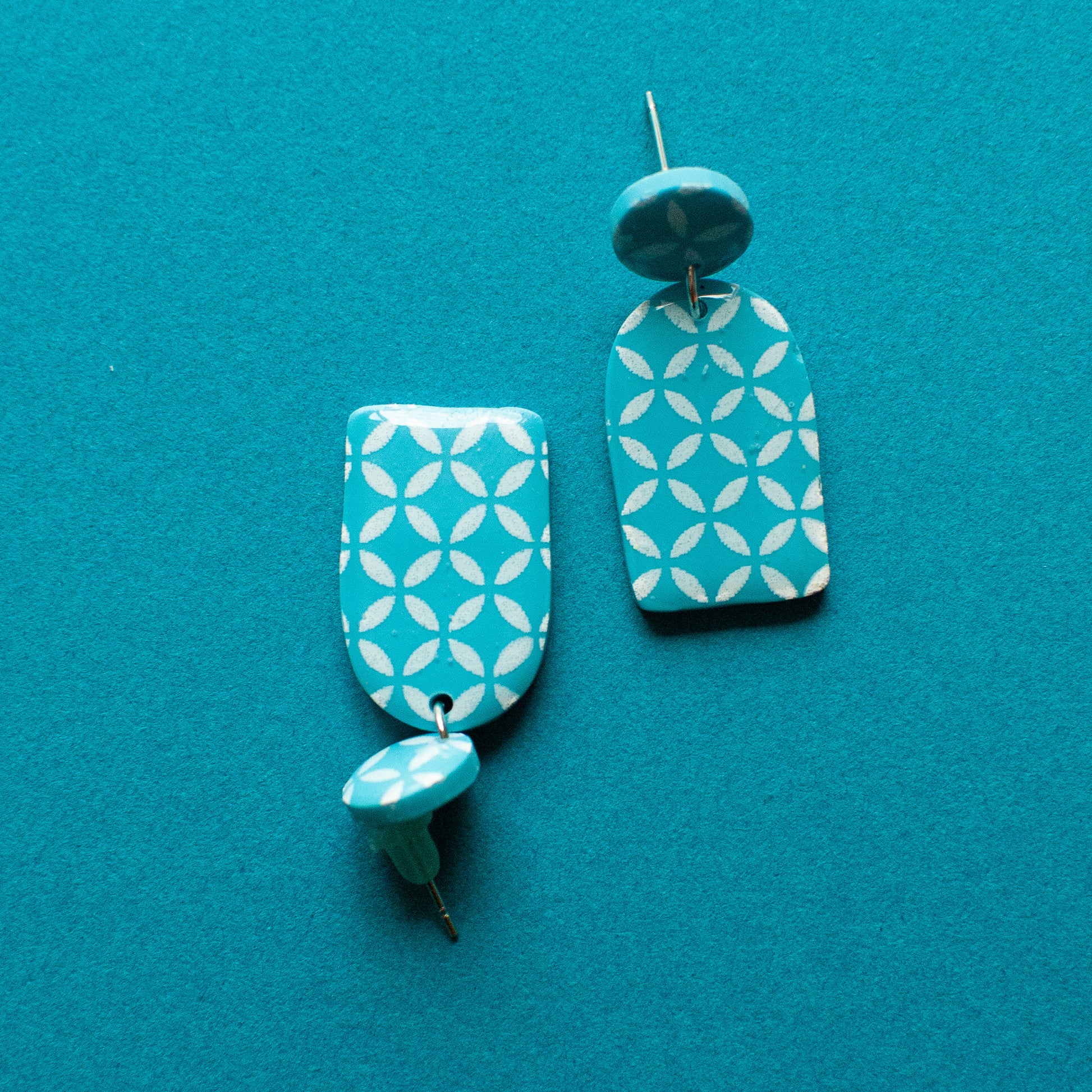Colourful arch shaped polymer clay earrings with a geometric pattern and a resin finish! Hypoallergenic stainless steel earring posts.