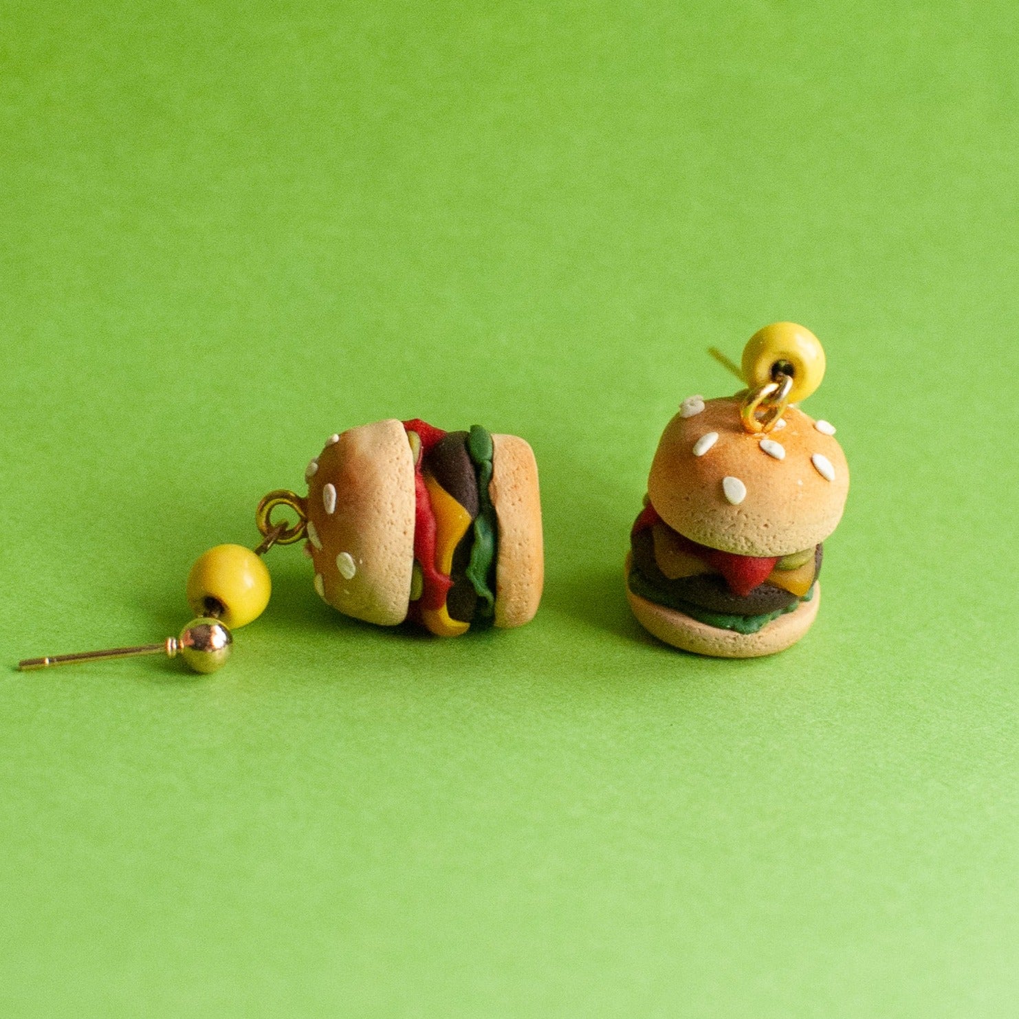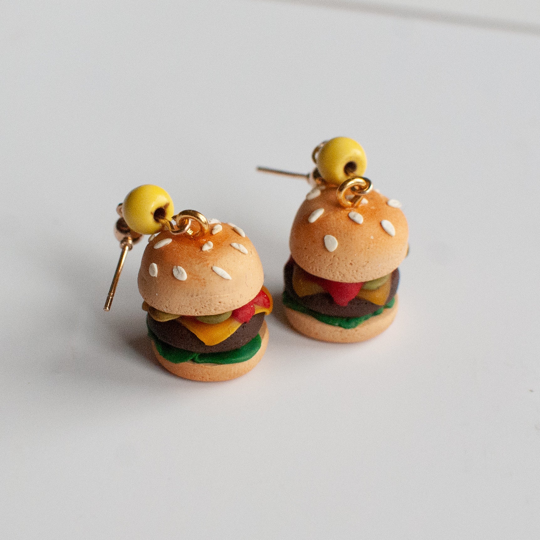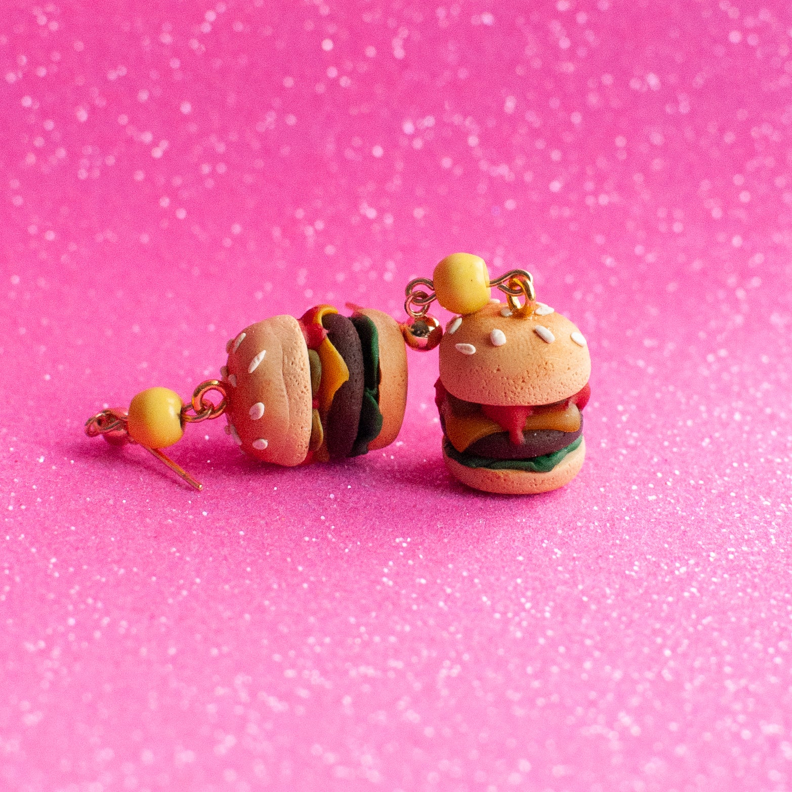 Handmade polymer clay burger charm earrings with a colourful bead accent.