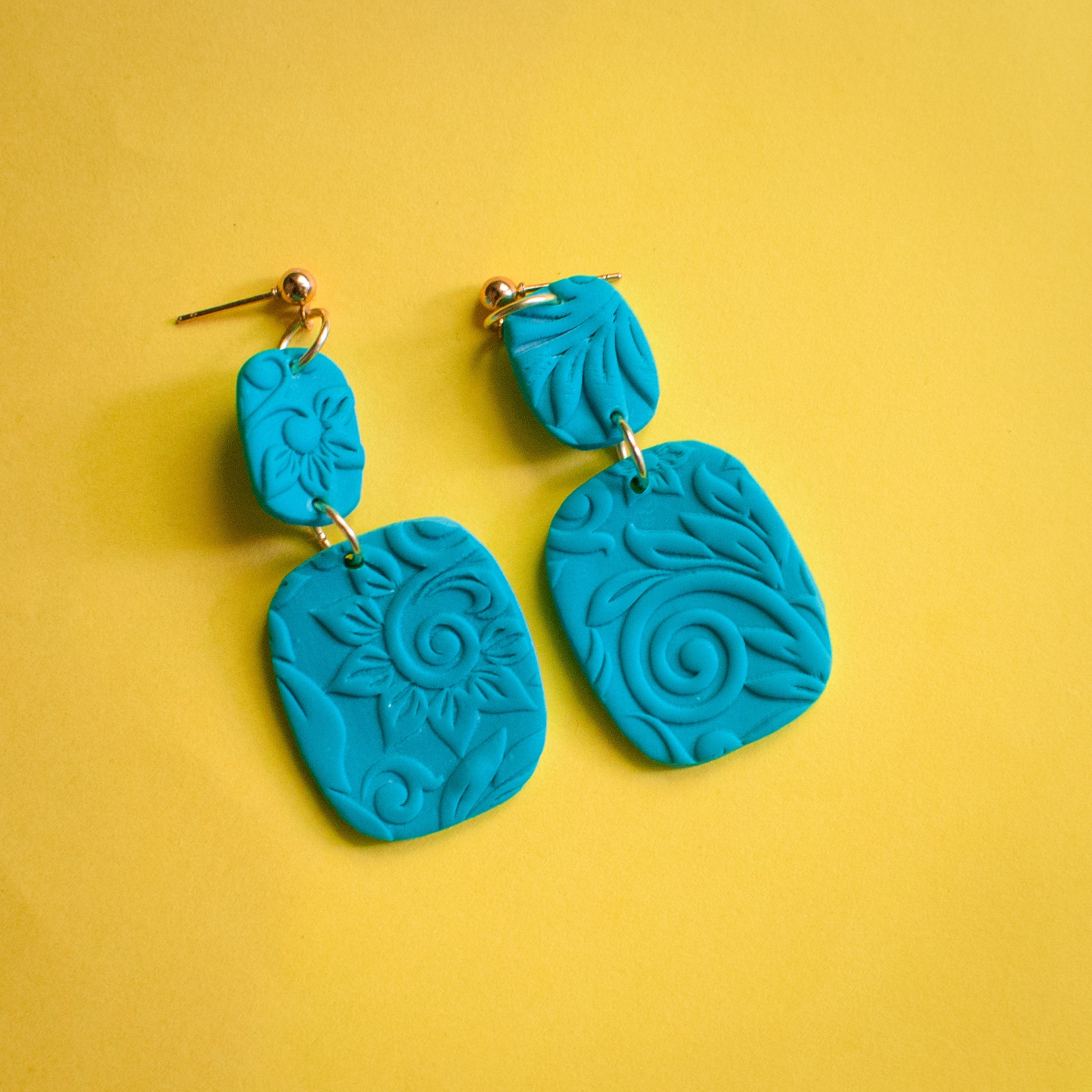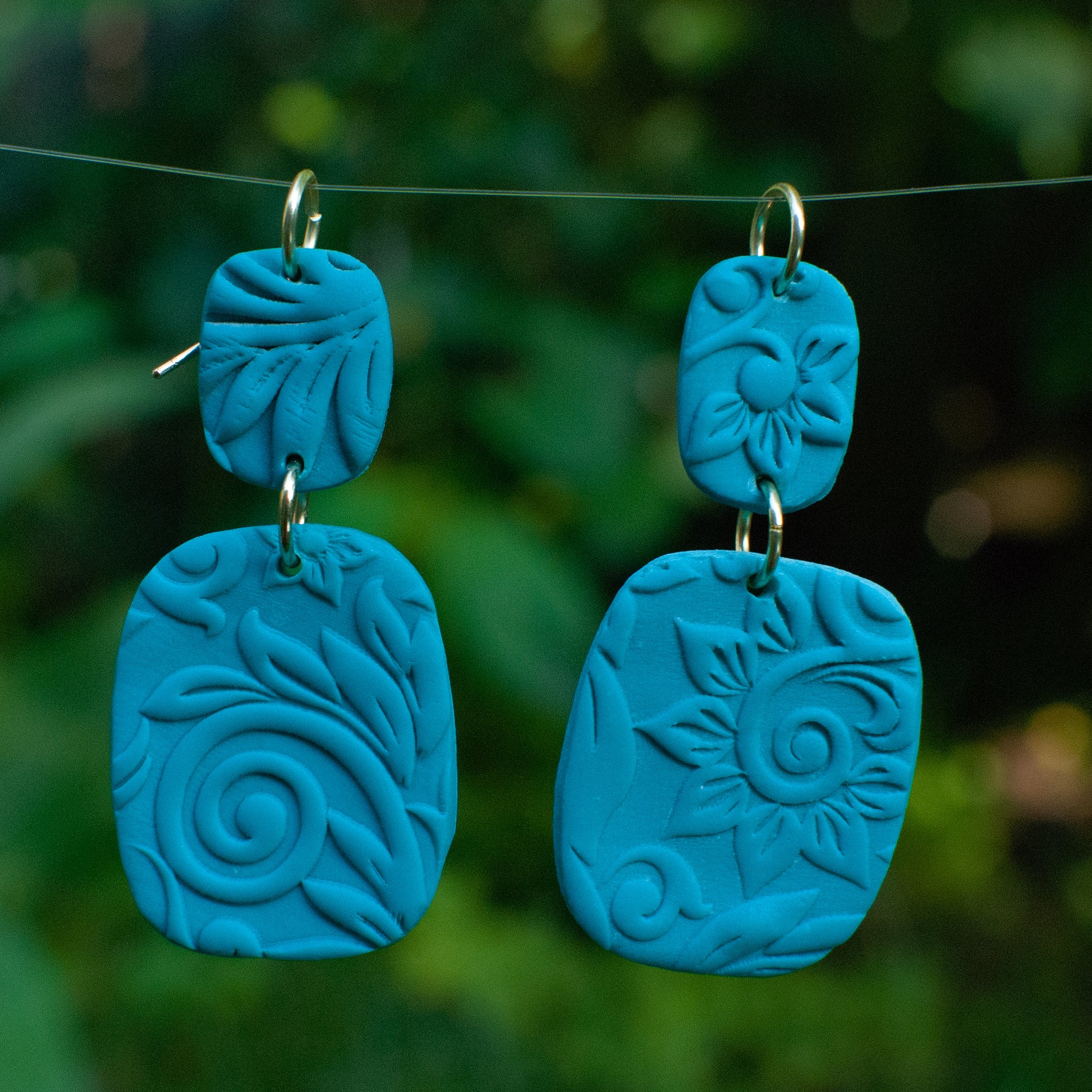 Handmade teal polymer clay drop earrings with floral debossing. They're kind of a staple for me now, and work with both casual and formal wear.