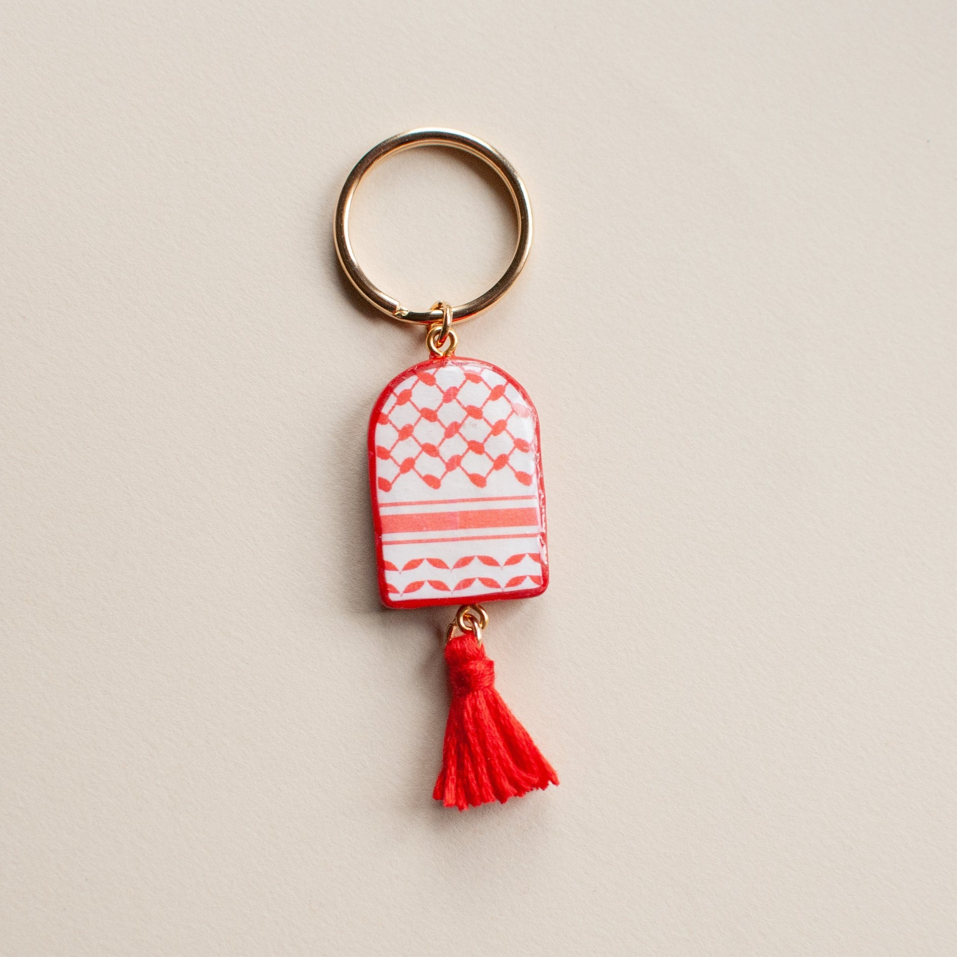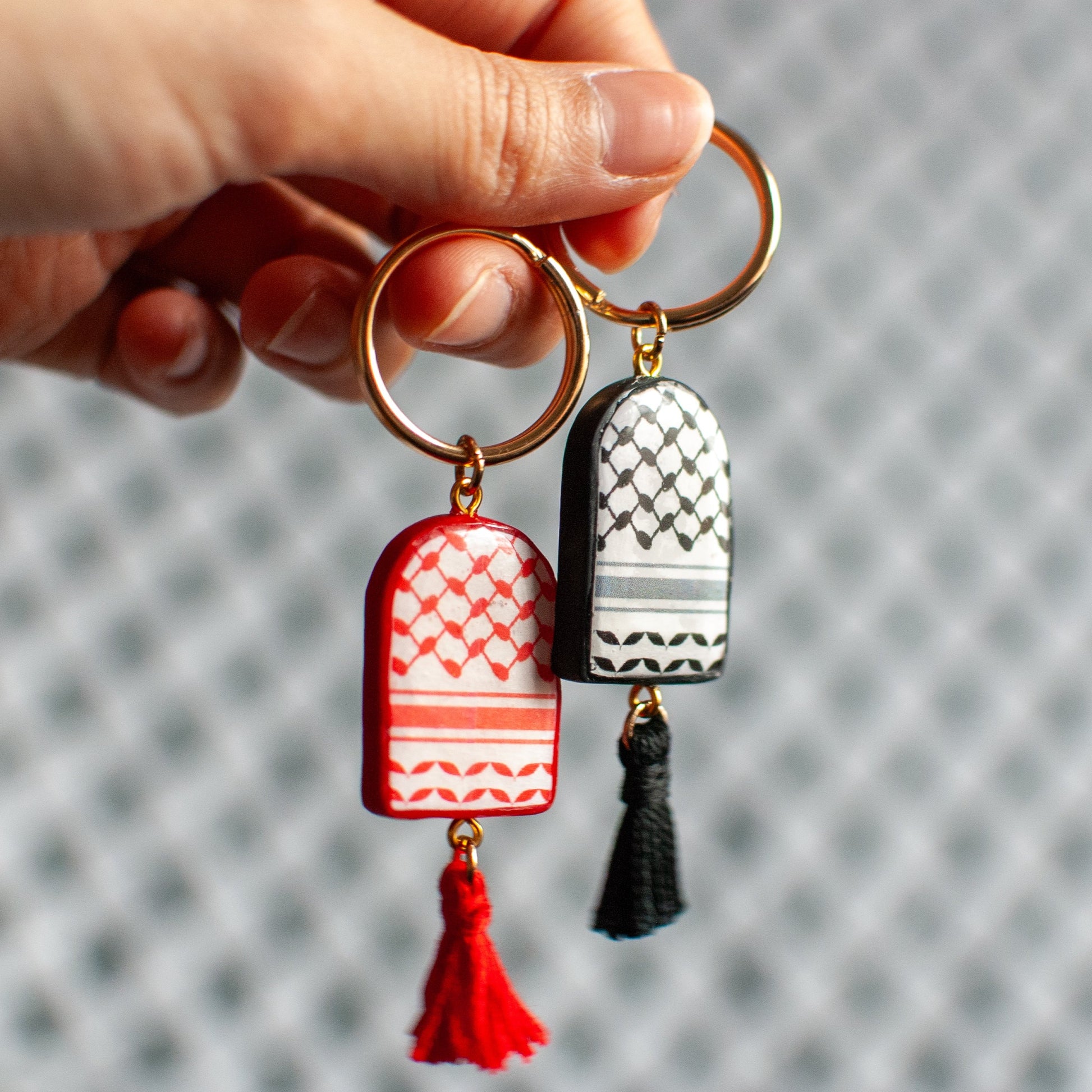 Rep your love for Palestine with these handmade keffiyeh keychains. Handmade with polymer clay and water transfer paper and a glossy resin finish. Even the tassels are handmade!