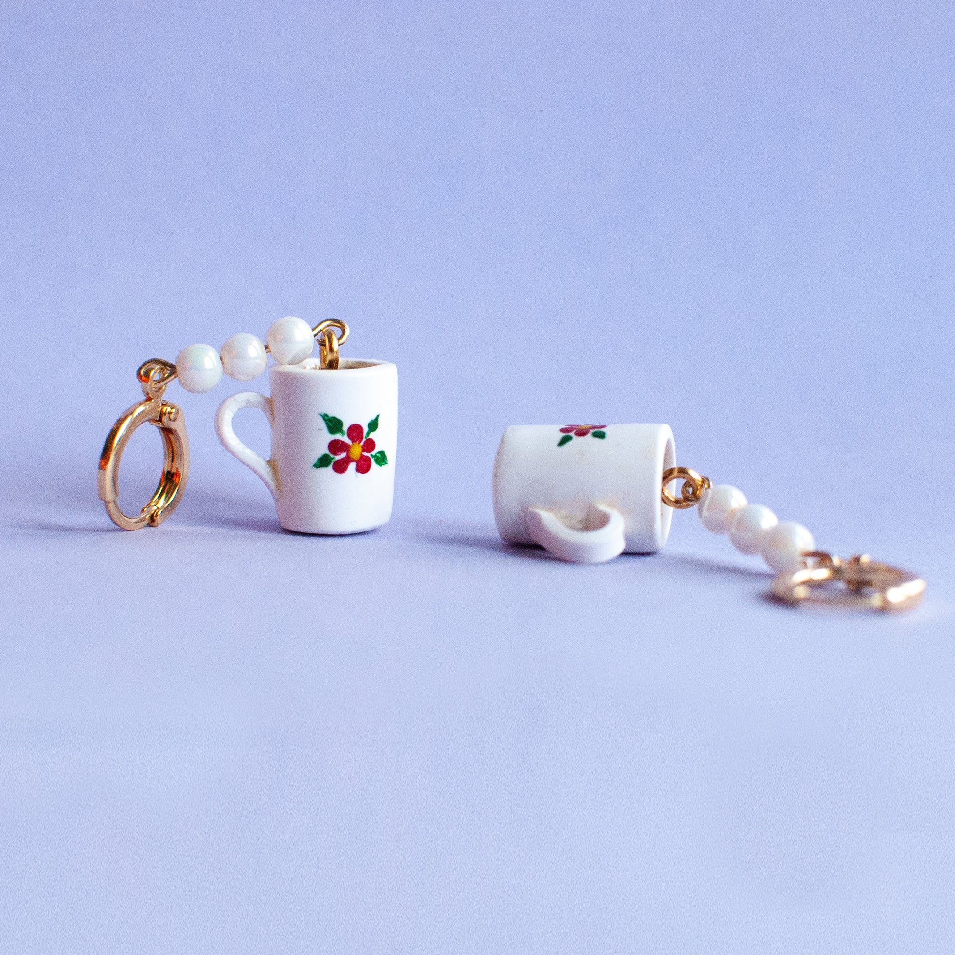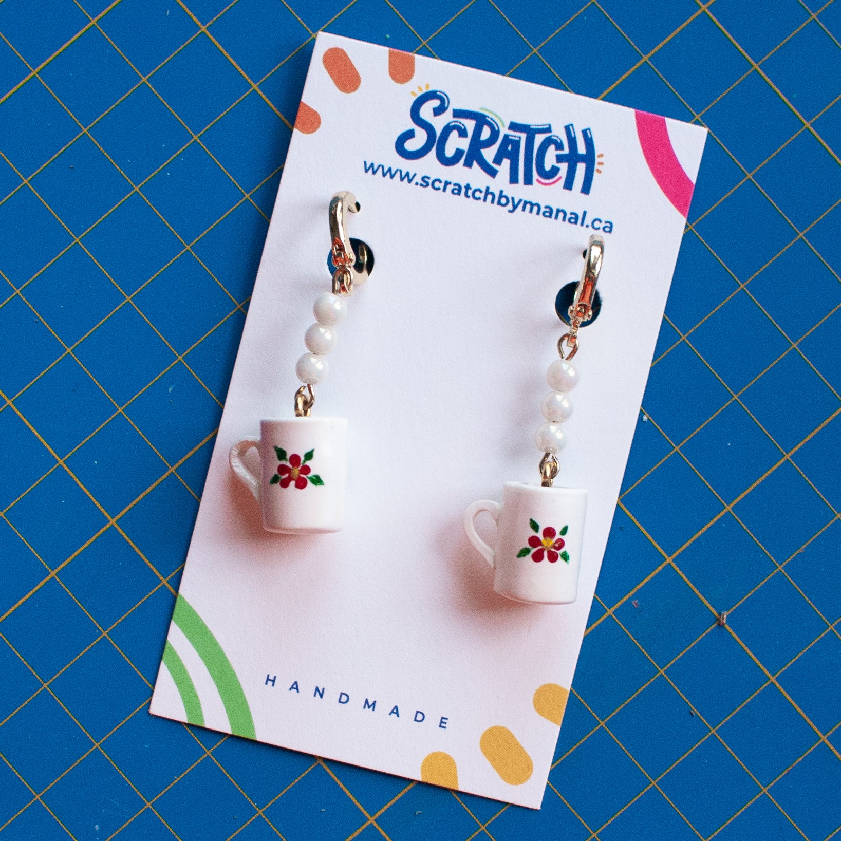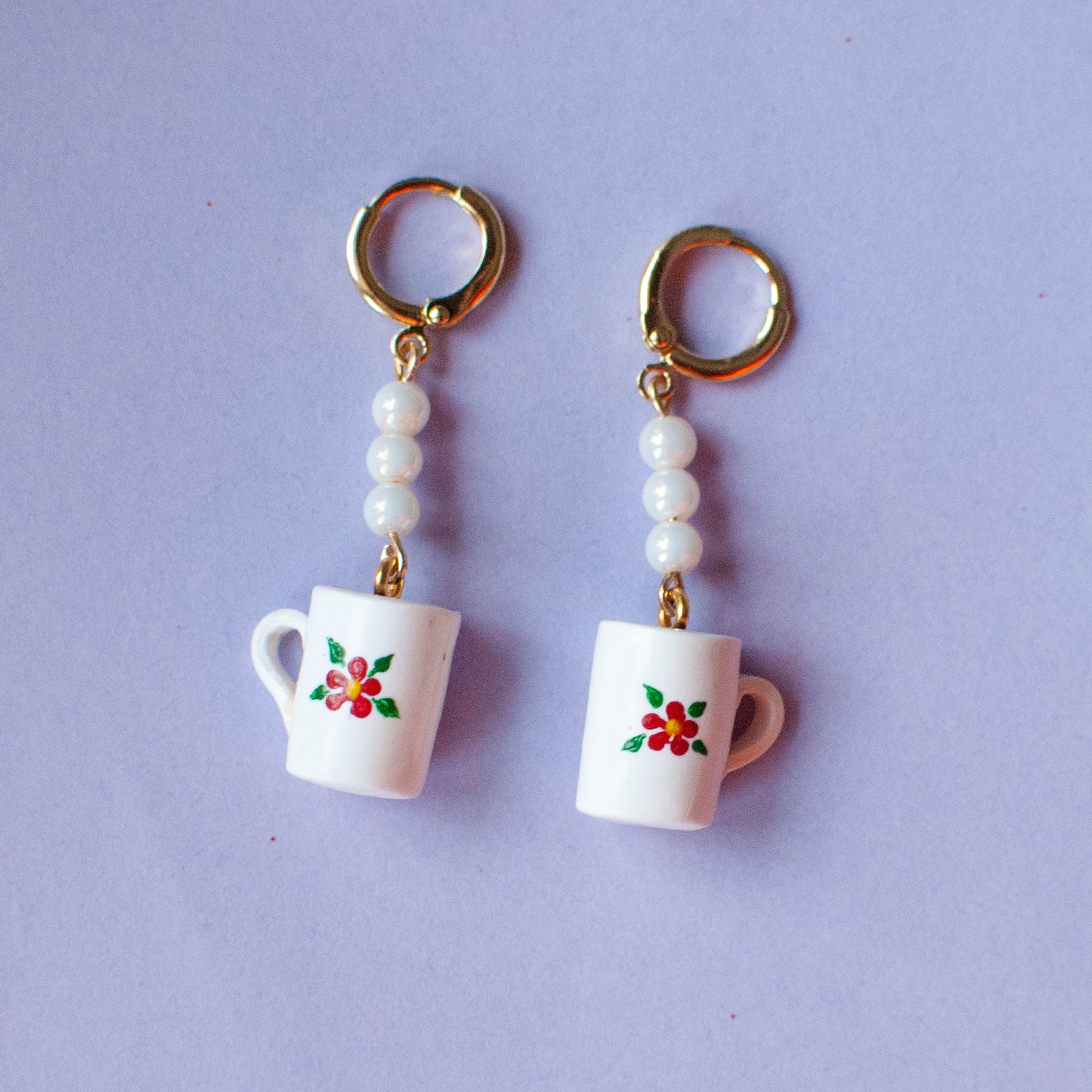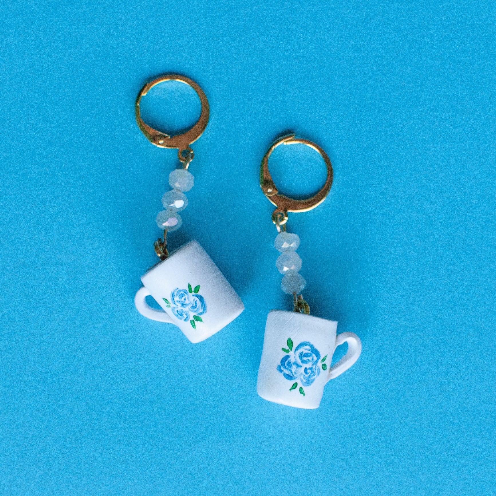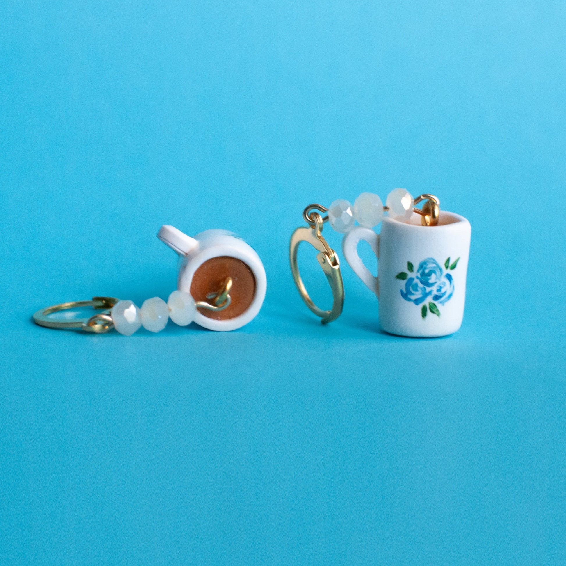 Polymer clay hand painted and varnished mug earrings, with glass bead accents.