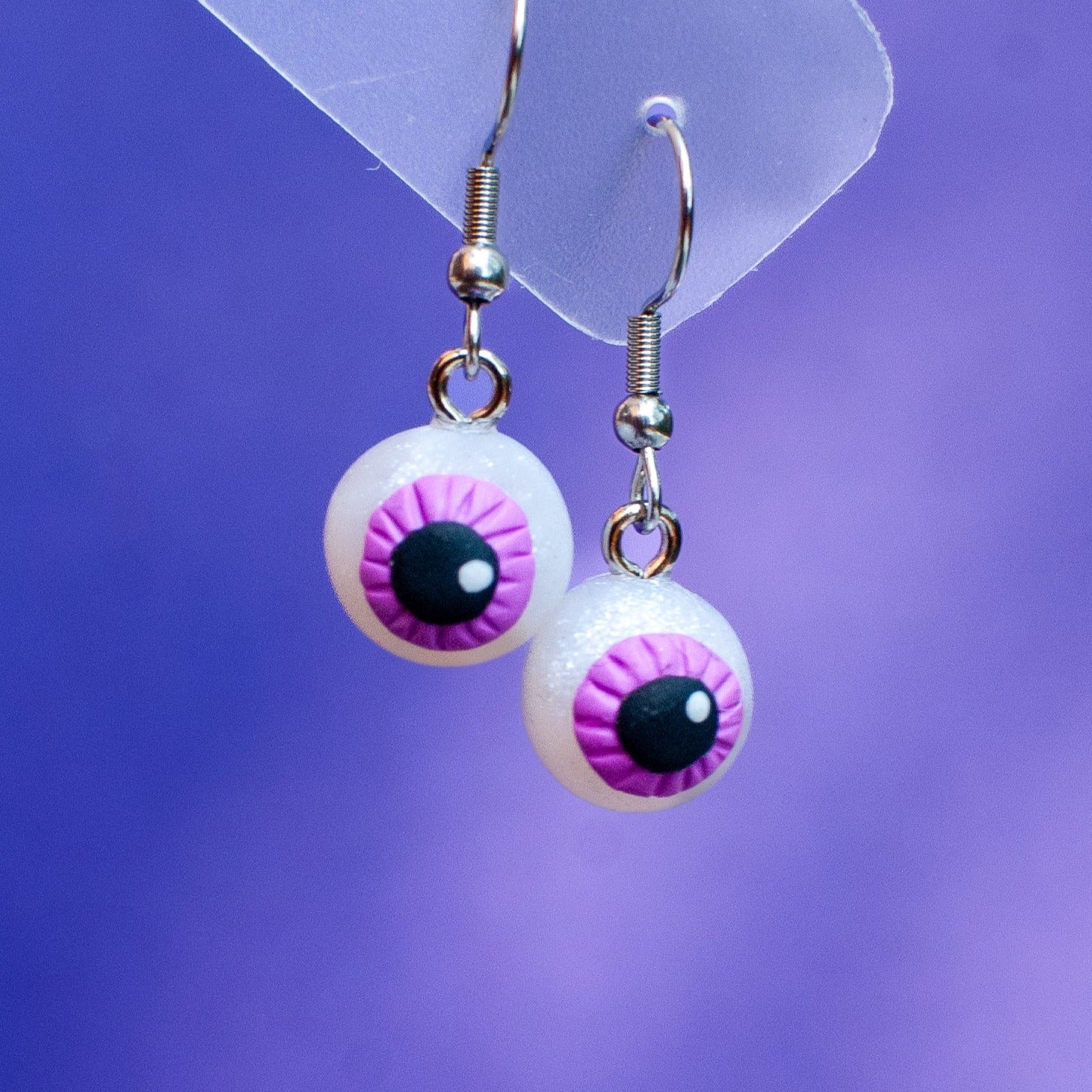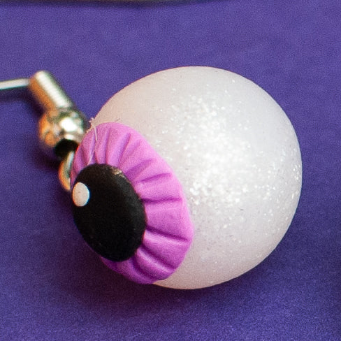 Transluscent and glittery handmade polymer clay eyeball charms on a hypoallergenic fishhook earring.