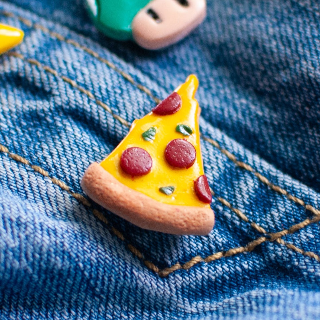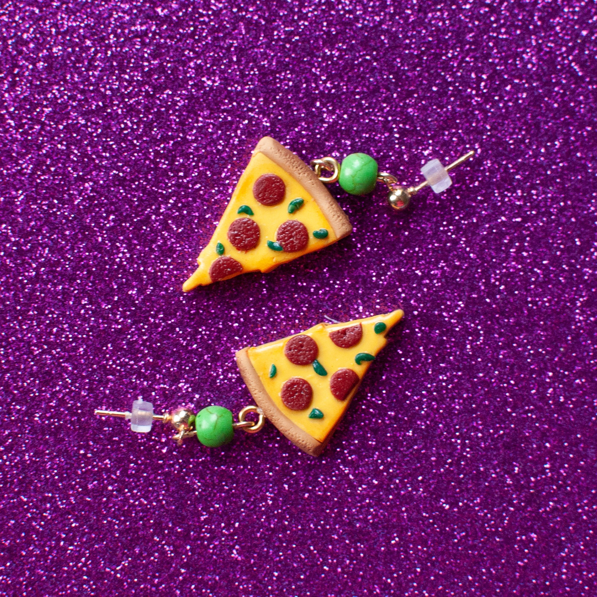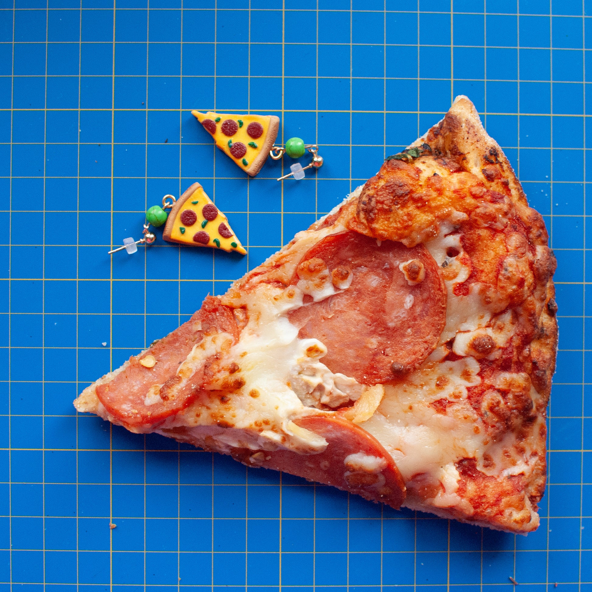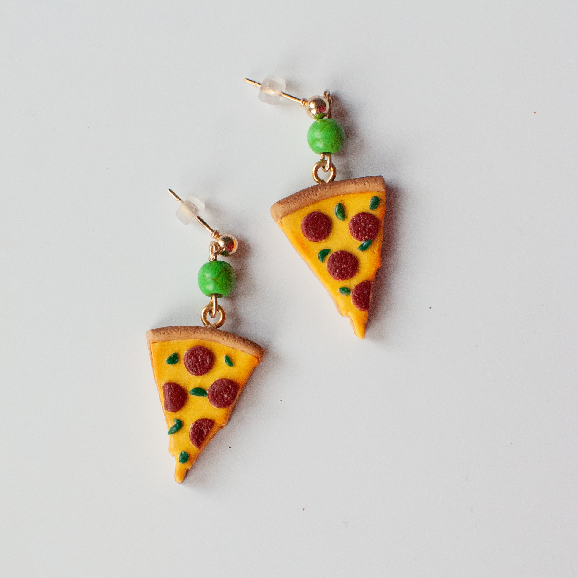 Polymer clay hand made pizza charm earrings with a wooden bead accent. Bead colour may vary!